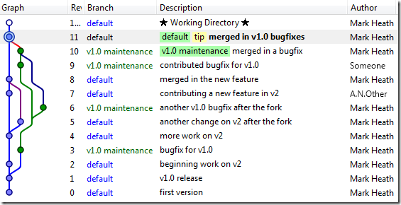 And that is pretty much all you need to know to work with named branches. With your repository in this state you still have two branches (default and v1.0 maintenance) which you can continue work on separately. Here’s a screenshot of a repository which has had the steps above performed on it: