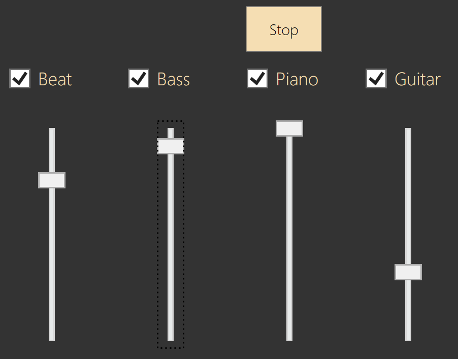 , which converts to 32 bit floating point, and has a Volume property (1.0 is full volume). To ensure that the four parts remained in sync, when you deselect a part, it doesn't actually stop it playing - instead it sets its volume to 0.