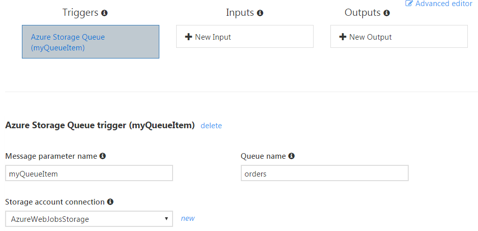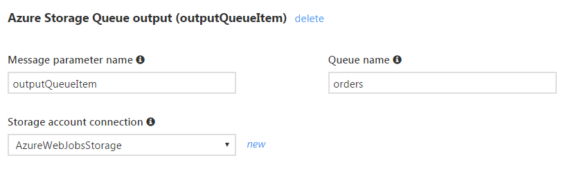 I’ll call my queue “orders”, and Azure Functions will automatically create it for me.