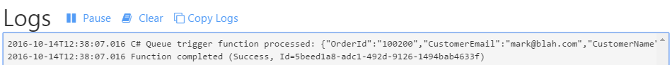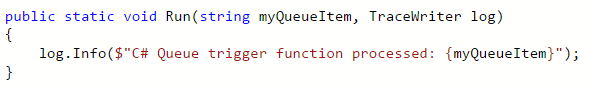 By clicking this, it will auto-fill in the bindings for my new function, giving me a new function all set up to read off the queue and log each message received: