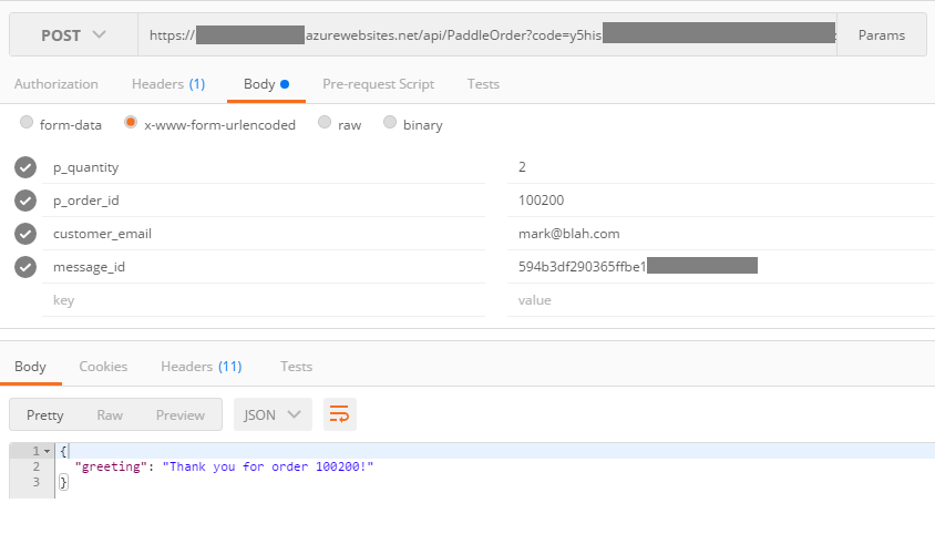 We can easily test our function using Postman (can’t use the portal in this case as it only sends JSON), and sure enough the webhook function is successful, and we can see in the logs for the license generation function that a message was indeed posted to the queue.