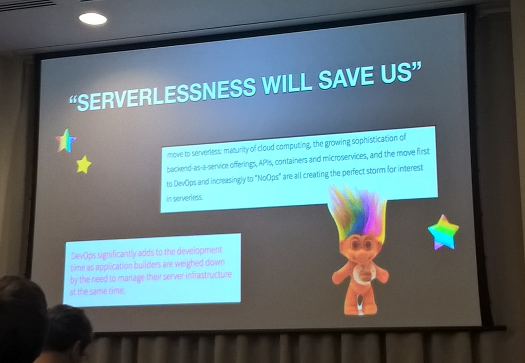 And this theme of “serverless not quite ready for the prime-time” kept cropping up throughout the conference. Many speakers warned of gotchas they had run into, and weaknesses with the tooling. Charity Majors pulled no punches in an entertaining talk where she hammered home the risks of relying so heavily on third party services. Like Patrick’s talk, it could be interpreted as a vote of no confidence in serverless, but she also closed by saying that it’s a good thing but “not mature”. It’s a talk worth checking out once the conference recordings become available.
