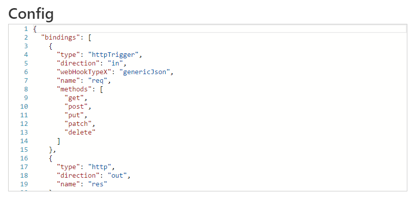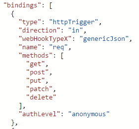 You’ll want to add in a new “methods” property of the “httpTrigger” binding, containing all the verbs you want to support. I’ve added get, post, put, patch and delete