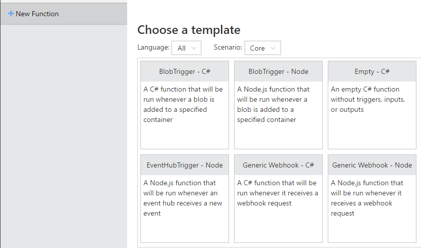 From within the portal, select “New Function”, and choose the “Generic Webhook – Node” option.