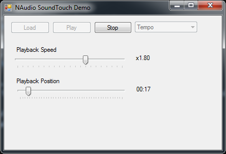 The one other thing worth mentioning in the demo project is that I allow you to reposition in the file, and when you do so, it’s a good idea to tell SoundTouch that a reposition has taken place so internal buffers can be flushed. This is done by calling Reposition on the VarispeedSampleProvider.