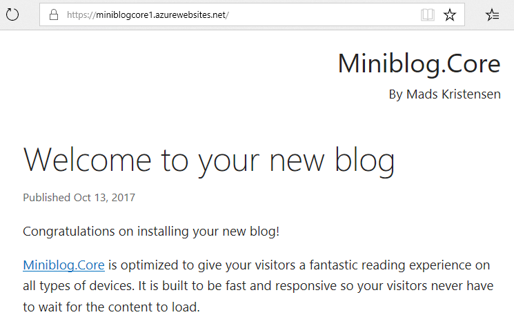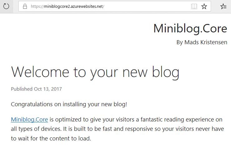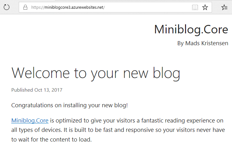In this post I’m going to demonstrate four super easy ways to deploy a ASP.NET Core website in Azure. For the demo website we’ll use Mads Kristensen’s Miniblog.Core ASP.NET Core 2 blogging engine. (It’s the successor to Miniblog which I used as the basis for this site). And we’ll of course use the Azure CLI to automate the process.