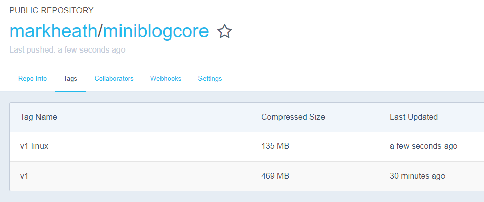 By the way, the first time I did this I accidentally built a Windows container (tagged as “v1”), so I had to push again (with the “v1-linux” tag). Here’s the two containers and you can see that Linux offers us a much leaner container size: