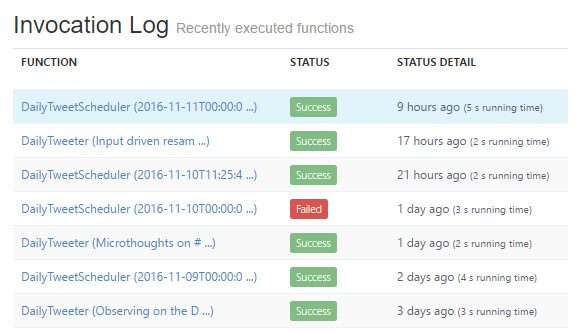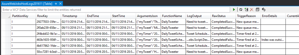 Obviously for troubleshooting an individual issue, the portal or KUDU would be better, but it’s great to also have access to all the data in table storage in case you want to automate your own processes to look for errors or certain conditions and send yourself an alert (you could even write another Azure Function to do that!)