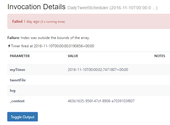 There is unfortunately an issue that the contents of the logs message box is sometimes truncated. However, a recent update to the portal also surfaces the exception message – here “Index was outside the bounds of the array”. That enabled me to track down a stupid mistake in my function and get it running again.
